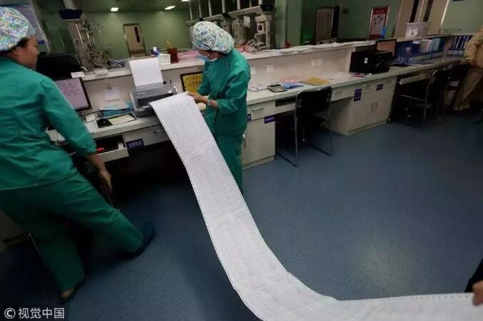 2016年12月30日,河南洛陽(yáng)。20歲少女患重病住ICU一年,欠費(fèi)賬單100多米長(zhǎng)。